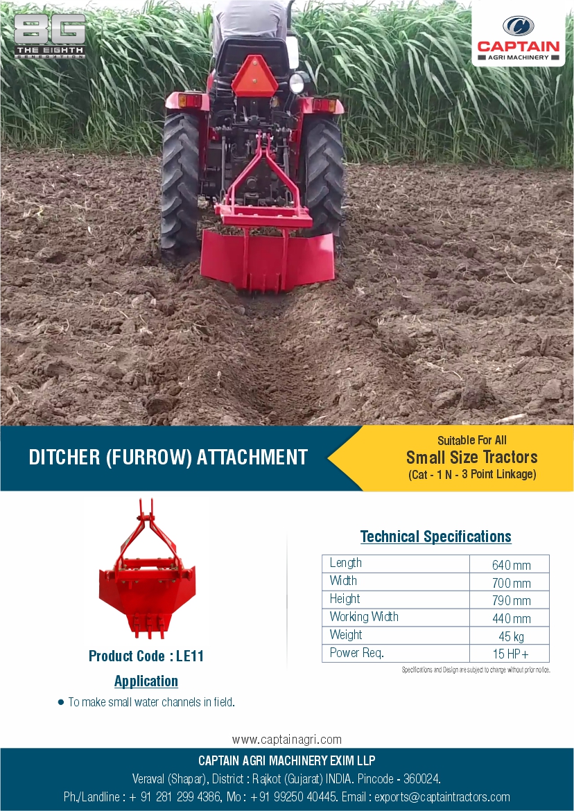 The Ditcher (Furrow) Attachment is designed to create uniform furrows and drainage channels in a single pass. Its precision blades shape clean, consistent trenches suitable for irrigation, planting, and water management. Ideal for vegetable growers, sugarcane fields, and horticulture, it ensures accurate depth and width for efficient field operations.