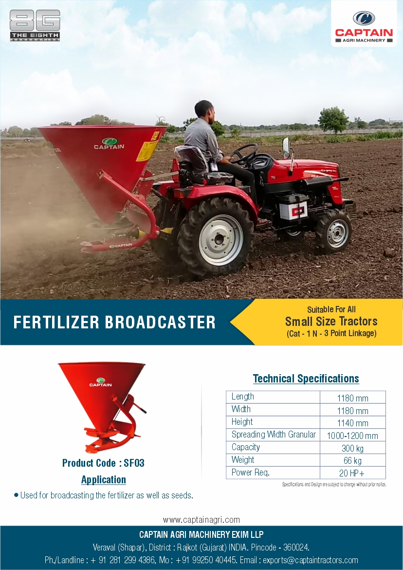 The Fertilizer Broadcaster is designed for uniform spreading of granular fertilizers across fields with minimal effort. Its precision spreading mechanism ensures even nutrient distribution, improving crop growth and reducing wastage. Suitable for large farms, orchards, and plantations, it enhances productivity while saving time and labor.