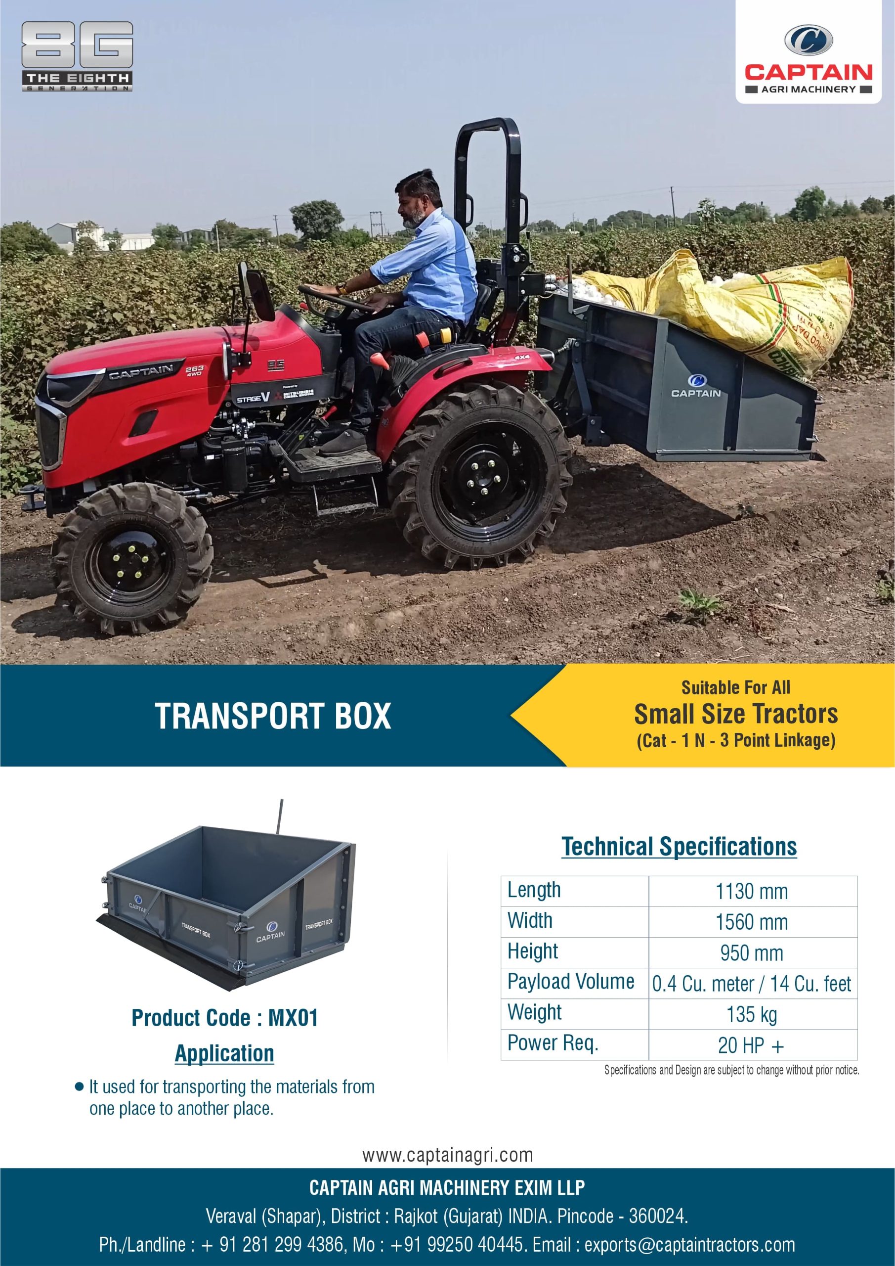 The Transport Box is a versatile tractor-mounted attachment used for carrying farm produce, tools, fertilizers, and other materials. Its strong, spacious design allows easy loading and unloading, making it ideal for field operations, material handling, and general farm transport. Built for durability, it offers reliable performance in daily farm use.